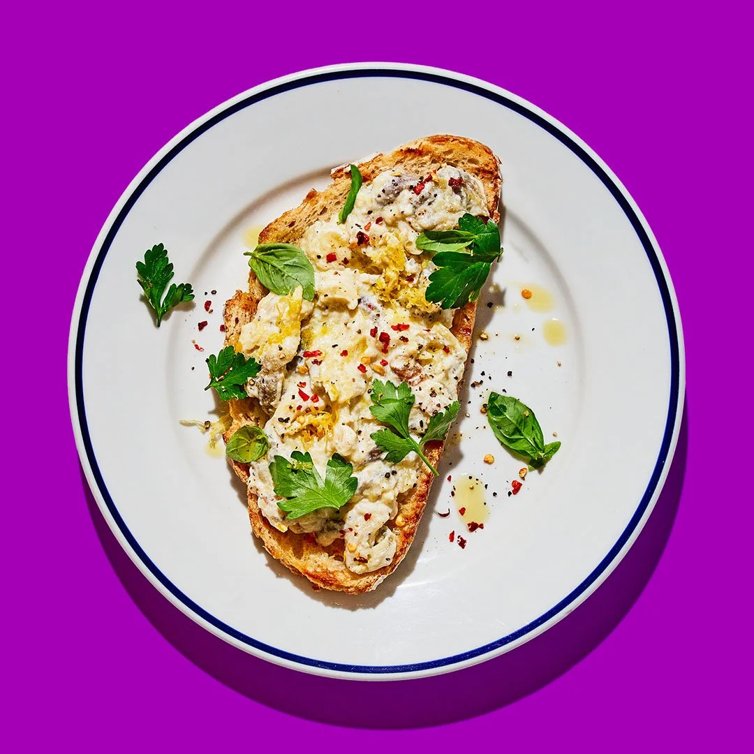 Rooster twee dikke plakken brood goudbruin. Smeer in met het auberginemengsel, bestrooi met chili flakes en verse kruiden, en drizzle er wat olijfolie over.